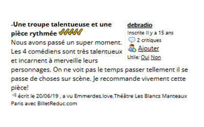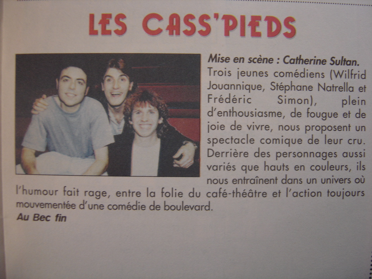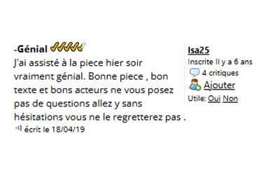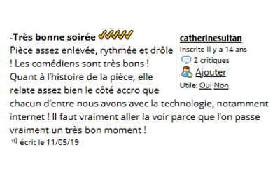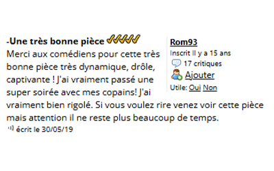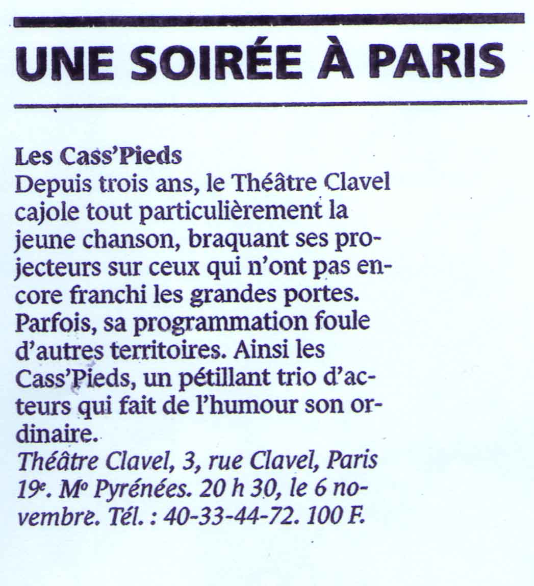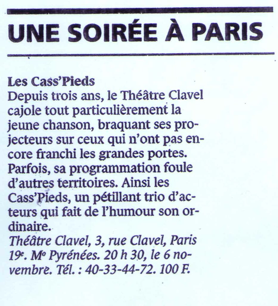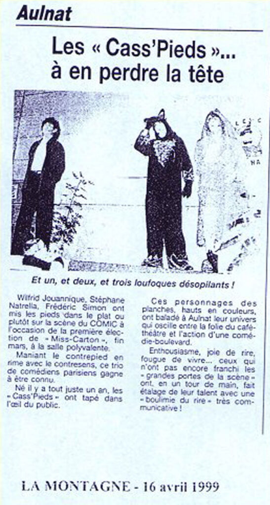 Les Cass'Pieds Prod Contact Espace Pro Médias Écriture & Coaching Spectacles Compagnie Compagnie Spectacles Écriture & Coaching Médias Espace Pro Contact Les Cass'Pieds Prod Presse Voir plus d'avis sur Billet Réduc' Télé 7Jours Ici Paris Le Monde Jour des Spectacles La Montagne France Dimanche Télé 7Jours Ici Paris Le Monde La Montagne France Dimanche Journal des Spectacles Accueil Espace Pro Contact SACD